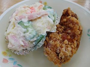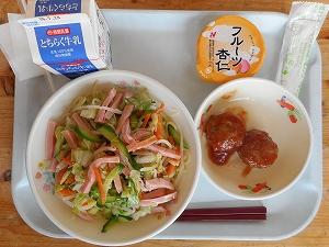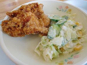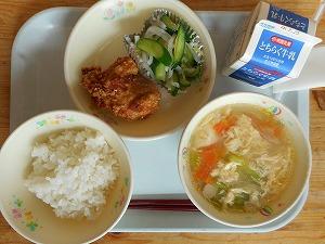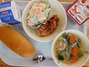 久しぶりの給食の献立は、「鶏唐揚げ・コッペパン・牛乳・コールスローサラダ・肉入りワンタンスープ」でした。今日もおいしくいただきました。