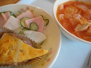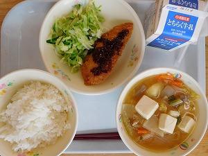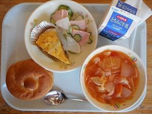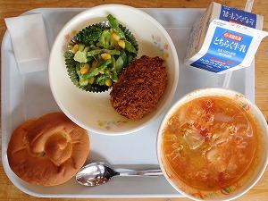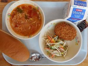 先週金曜日は,献立を掲載できず,申し訳ありませんでした。金曜日と月曜日の献立を合わせて紹介します。金曜日は,「ご飯・牛乳・納豆・かぶの香り漬け・筑前煮」でした。今日は,「米粉パン・牛乳・グリーンサラダ・栃木県産豚肉コロッケ・トマトスープ」でした。どちらもおいしくいただきました。特に,『私の好きな料理100選』に入る,トマトスープは,うれしい気持ちにさせてくれます。月曜日から,一層がんばろうという気持ちになりました。
