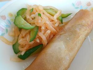 今日の献立は、「ご飯・牛乳・なすとトマトの和風麻婆・春巻き・キムチ和え」でした。なすとトマトの和風麻婆は、食べ応えがありおいしかったですね。これも『私の好きな料理100選』に入るものです。キムチ和えは、子供たちにはちょっと辛いのではと心配しましたが、どうだったでしょうか!? 今日もおいしくいただきました。