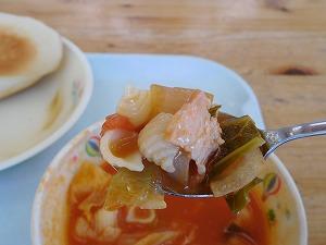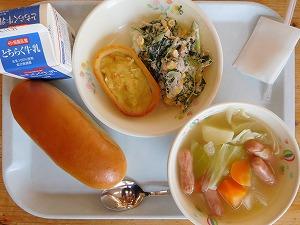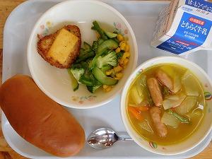 今日の献立は,「ミルクパン・牛乳・白身魚フライ・ボイルキャベツ・ミネストローネスープ」でした。今日もおいしくいただきました。ごちそうさまでした。これで一週間のいいスタートが切れます。