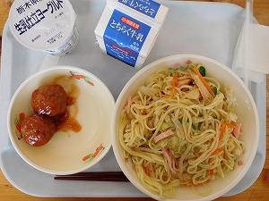 今日の献立は,「大盛りスパゲティナポリタン・牛乳・温野菜サラダ・レモンゼリー」でした。スパゲティとサラダがいい感じでマッチしていました。とても美味しかったです。ごちそうさまでした(少し,食べすぎかな!?運動しなくては…)。