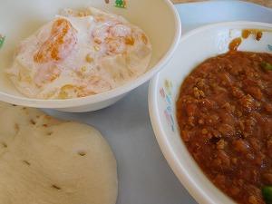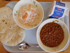 今日の献立は、「ナン・キーマカレー・牛乳・ヨーグルト和え」でした。今日もおいしくいただきました。キーマカレー、いい味でしたね。ナンとの相性がやはりいいようで、いつの間にか完食していました。明日からは、3連休になります。事故やけがに注意して過ごしてくださいね。