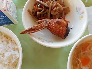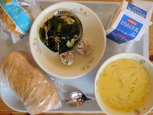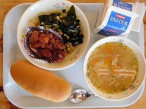 今日の献立は、「コッペパン・牛乳・鶏唐揚げ・海藻サラダ・オニオンスープ」でした。揚げたての唐揚げにオニオンスープがいい感じです。そして、海藻サラダがそれを引き立てていました。もちろん、今日も完食です。おいしくいただきました。ごちそうさまでした。