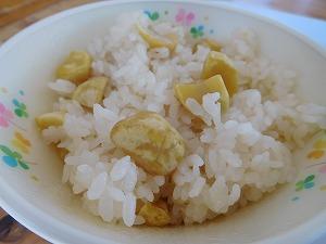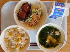 今日の献立は,「栗ご飯・牛乳・肉団子・ゴボウサラダ・味噌汁」でした。味噌汁には,地元大渡産のニラをふんだんに使い,一層おいしさが増していました。秋の味覚,「栗ご飯」は旬の食材である栗を使った和食の一品です。今日も完食,おいしくいただきました。