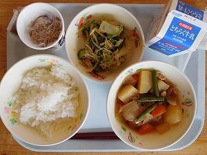 今日の献立は、「ご飯・牛乳・切り干し大根の煮物・アジフライ・雷汁」でした。ちょっぴり寒さを感じる今日のお昼、できたての自校給食は、身も心も温まります。うれしい限りです。もちろん今日も、完食です。ごちそうさまでした。
