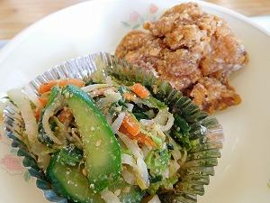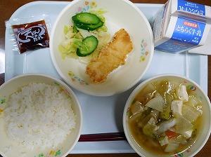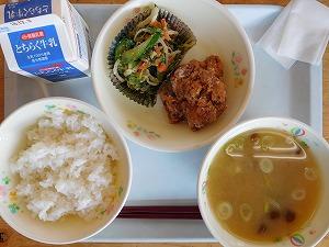 今日の献立は,「ご飯・牛乳・鶏唐揚げ・五目野菜のごま和え・みそ汁」でした。厨房のフライヤーで揚げた,揚げたての唐揚げを食べられるのも,自校給食ならではです。そういえば今日は,11(いい)29(にく)の日でしたね (-_-;)・・・一層おいしくいただきました。ごちそうさまでした。