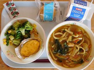 今日の献立は,「カレーうどん・牛乳・ブロッコリーサラダ・シューアイス」でした。体がとても温まります。うれしい給食です。