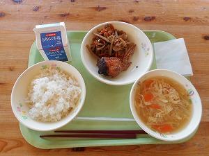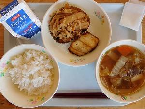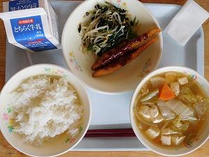 今日の献立は,「ご飯・牛乳・豚肉のショウガ炒め・みそ汁」でした。ニラと油揚げ,豆腐の入ったみそ汁は,特においしくいただきました。炊きたての白いご飯に温かなみそ汁,日本人に生まれてよかったと思う瞬間の一つでしょうか。すべておいしくいただきました。完食です。ごちそうさまでした。