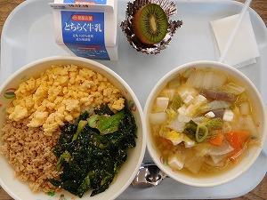 今日の献立は,「三色丼・牛乳・田舎汁・キウイ」でした。キウイは,轟小産(もちろん検査済み)でした。瑞々しく甘酸っぱい味が,口の中に広がりました。今日から,ランチルームワックスがけ準備のため,当分の間使えないため,図工室で検食をしてみました。図工室,私が結構好きな場所です。図工室は,「創造の源」の一つです。検食しつつ,そんなことを考えていたら,いつの間にか食べ終わっていました。今日もおいしくいただきました。ごちそうさまでした。