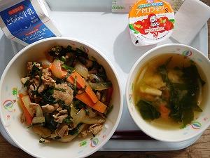 今日の献立は、「スタミナ丼・ご飯・牛乳・卵とわかめのスープ」でした。今日もおいしくいただきました。完食です。ごちそうさまでした。