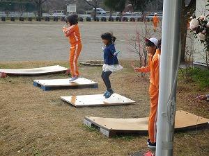 昨日お伝えしました,用務員さんがつくっていた縄跳び練習台が完成しました。早速,子供たちが使っている様子も御紹介しましょう。