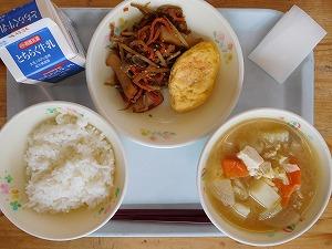 今日の献立は,「ご飯・牛乳・オムレツ・きんぴらごぼう・豚汁」でした。今回は,トロホッケからオムレツへの一部メニューの変更がありましたので,御了承ください。寒い季節,できたての豚汁は,体の芯から暖めてくれます。ありがたいことです。今日も,おいしくいただきました。ごちそうさまでした。