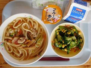今日の献立は、「大盛りきつねうどん・牛乳・ブロッコリーサラダ・フルーツ杏仁」でした。ほうれん草サラダ⇒ブロッコリーサラダへの変更がありました。御了承ください。