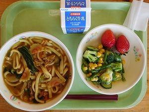 昨日と今日の献立を紹介します。昨日19日は,「大盛りカレーうどん・牛乳・グリーンサラダ・いちご」でした。「いちご(とちおとめ)」は,もちろん地元産です。今回は,JA上都賀様からの「食育応援事業」からの贈呈品です。おいしいいちごをありがとうございました。