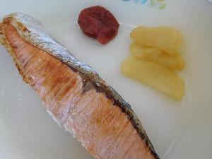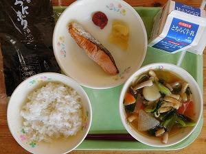 今日の献立は,「最初の給食を知ろう」というテーマでした。「ご飯・牛乳・焼き魚(鮭)・たくあん漬け・すいとん汁」でした。