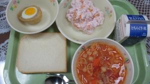 本日の献立「フルーツクリームサンド・牛乳・スコッチエッグ・ミネストローネスープ」