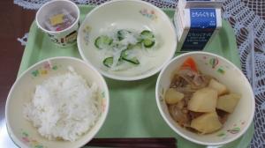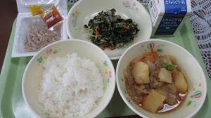 本日の献立「ご飯・納豆・牛乳・肉じゃが・大阪漬け」