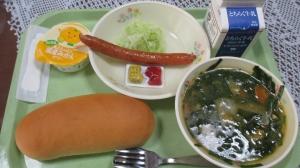 本日の献立「ホットドック・牛乳・鶏肉とニラのピリ辛スープ・みかんゼリー」