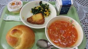 本日の献立「パンプキンパン・牛乳・チキンのチーズ焼き・ほうれん草のソテー・ミネストローネスープ・お米のババロア」