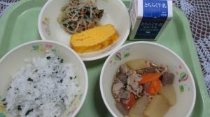 本日の献立「はちみつパン・牛乳・オムレツ・イタリアンサラダ・湯波入り和風シチュー」