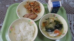 本日の献立「わかめご飯・牛乳・厚焼き卵・ほうれん草の胡麻和え・豚肉と大根の煮物」