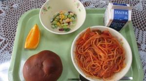 本日の献立「黒パン・牛乳・スパゲティナポリタン・ビーンズサラダ・オレンジ」