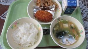 本日の献立「ご飯・牛乳・豚肉のコロッケ・切り干し大根の煮物・みそ汁」