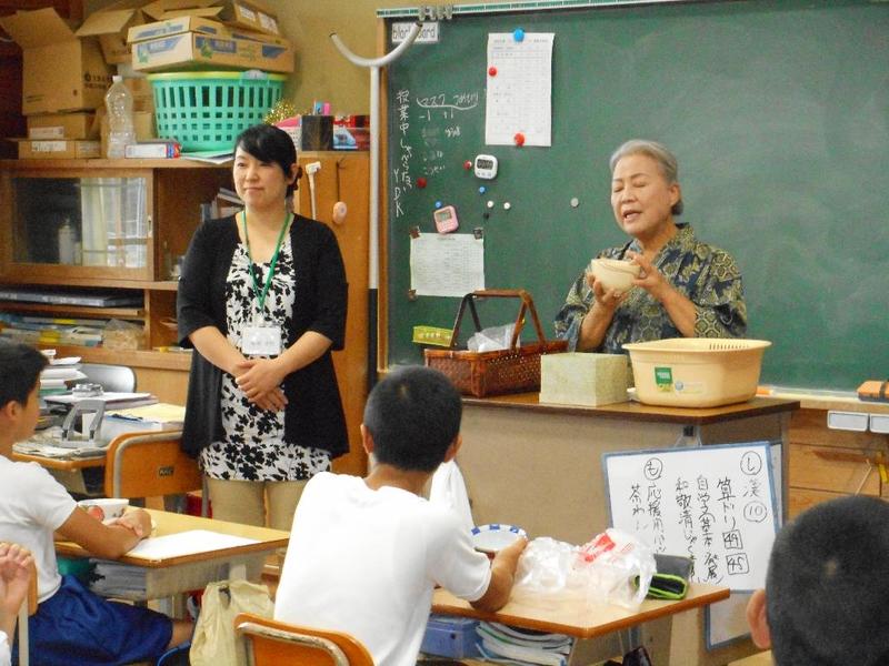 6年生が総合的な学習の一環として、町谷にお住いの萬徳宗正先生をお招きして「茶道教室」を実施しました。萬徳先生には10年以上にわたりご指導をいただいております。