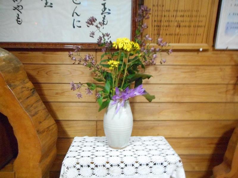 芹沼にお住いの渡邊勝郎さんがお花を持ってきてくださいました。今回はコルチカム・ツワブキ・ホトトギスです。早速、玄関やホールに飾らせていただきました。一気に秋の装いとなりました。いつもありがとうございます。