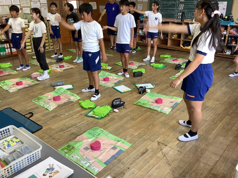 9/2(火)5校時に、5・6年生を対象に体育の保健分野の学習として、赤十字救急法短期講習が行われました。ねらいは、緊急時の救急法について正しく理解できるようにすることと、効果的な救急法を知り、いざという時の状況を想定し、表現できるようにすることの2つです。