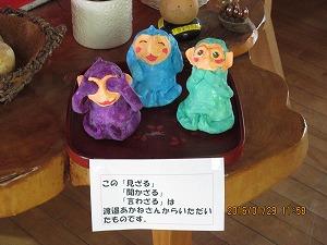 東照宮にある有名な三猿。皆さんよく御存知だと思います。 渡邉あかねさん作製の「見ざる」「聞かざる」「言わざる」をいただきました。早速ギャラリーに飾らせていただきました。御来校の際にどうぞ御覧ください。