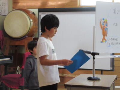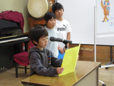 それぞれ「創立記念集会の全校遊び『陣取り』が楽しかった。3学期は、漢字をがんばりたい。」「2学期は係の仕事をがんばった。3学期は4年生に向けてしっかり準備したい。」「持久走記録会の練習からばんばったので体力がついた。来年もがんばりたい。来年は6年生になるので、自主学習をがんばりたい。」など、2学期の思い出や3学期の目標に向けて、素晴らしい発表でした。