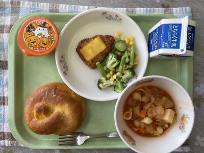 本日の献立「パンプキンパン・牛乳・チキンのチーズ焼き・グリーンサラダ・ミネストローネ・ハロウィンデザート」