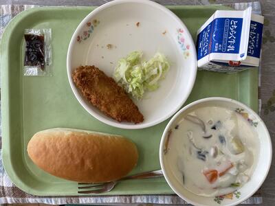 本日の献立「フィッシュバーガー・牛乳・さつまいもシチュー」