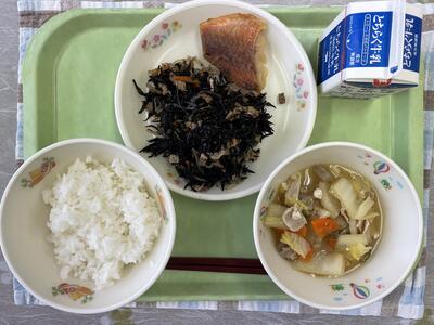 本日の献立「ご飯・牛乳・赤魚西京焼き・ひじきの炒め煮・豚汁」