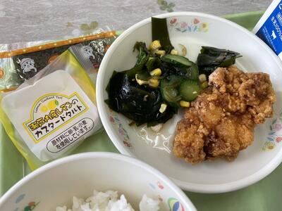 本日の献立「ご飯・牛乳・鶏から揚げ・海藻サラダ・コーンスープ・味付けのり・レモンタルト」