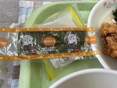 やはり人気メニューのから揚げ、外せません。カリッと揚がった衣が香ばしいです。そして、2年生は「絶対に味のりをつけてほしいです!」とリクエストがありました。栃木県のゆるキャラが描かれた味のりで、みんな満足そうにしていました興奮・ヤッター!