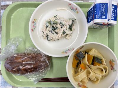 本日の献立「ココア揚げパン・牛乳・ほうとう・ツナサラダ」