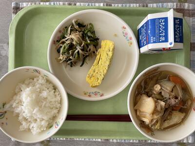 本日の献立「ご飯・牛乳・彩り野菜の卵焼き・おひたし・すき焼き風煮」