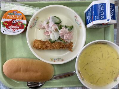 本日の献立「コッペパン・牛乳・エビフライ・コーンスープ・ハムと大根のマリネ・アセロラゼリー」