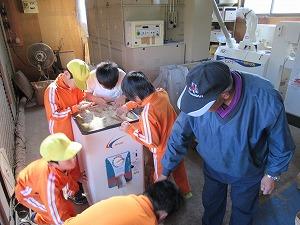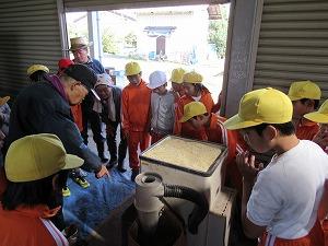 学校支援者の狐塚博成さんの作業場で4,5年生が参加して、精米作業が行われました。狐塚博成さんの御指導のもと、玄米から白米と糠ができる作業工程を4,5年生が体験しました。食卓でいつも目にしている「お米」が様々な工程を経て、できるということを学ぶ機会となりました。