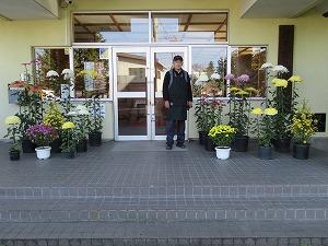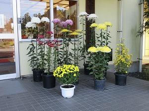 菊で飾られた職員玄関