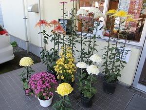 地域コーディネーターの渡辺新太郎さんが丹精込めて育てた菊を持ってきてくださいました。職員玄関に飾られた色とりどりの菊の花が、来校されるお客様をお迎えしています。様々な種類の菊の花が咲き競う姿は必見です。