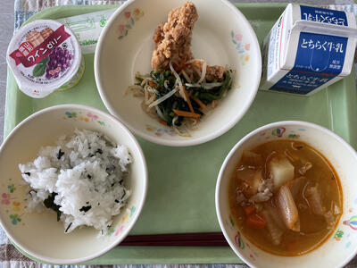 本日の献立「五穀ご飯・大根入りカレー・牛乳・ほうれん草のサラダ・県産ヨーグルト」