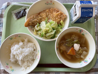 本日の献立「ご飯・牛乳・とんカツ・キャベツのピリッと漬け・田舎汁」