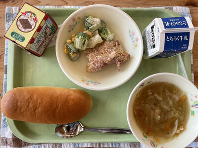 本日の献立「ミルクパン・牛乳・クリスピーチキン・花野菜サラダ・オニオンスープ・セレクトデザート」