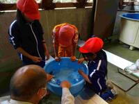胸びれを切るときにイワナが落ち着いているように、お水に薬を入れました。暴れなくなったので、切ろうとしたら急に暴れ出しました。怖くなって、先生に手伝ってもらってやっと切ることができました。(児童からインタビューより)