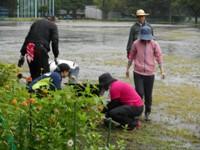 今朝早くから、多くの方に御協力をいただき、第2回PTA奉仕作業を実施しました。始まりは曇り空でしたが、あっという間に雨が降ってきてしまいました。そんな中でしたが、保護者の方も児童の皆さんも雨に濡れながら、一生懸命校庭の草取りをしてくれました。