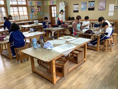 10/21(火)に、渡邉あかねさんが図工ボランティアに来てくださいました。今回は、1・2校時に4年図画工作の版画をご指導してくださいました。子供たちそれぞれに、人物の動きのある見本の絵を描いてくださり、子供たちは見よう見まねで版画の原案を試行錯誤しながら、わたしらしく描いていました。丁寧なご指導に感謝です!(*^o^*)