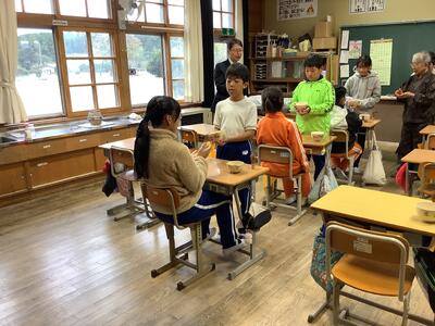 10/22(水)1校時、茶道体験学習の3日目です。器の渡し方、受け取り方の作法、礼や感謝することの大切さを教えていただきました。ご指導ありがとうございます。